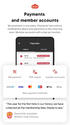 - notifications, all important information at hand - communication – clear messages and comments on team walls - events – calendars, excuse notes, attendance - payments – QR codes, card payments, proofs of payment - documents – sharing and submitting - consents – electronic solution for GDPR