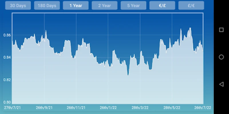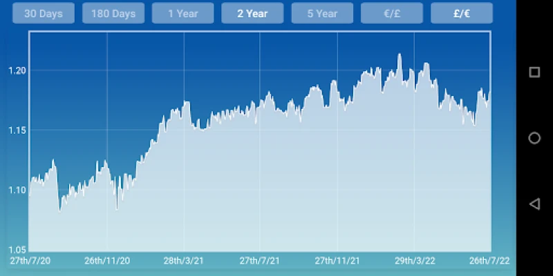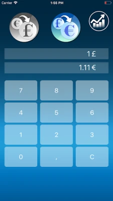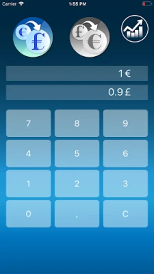 Includes charts with exchange rates. Eur to GBP ( sterling pound) . Without popup small keys keyboard. If the internet connection is not avaible, use the last exchange rate. Can work offline. Very easy and fattest. The result of conversion are instantaneous and direct.