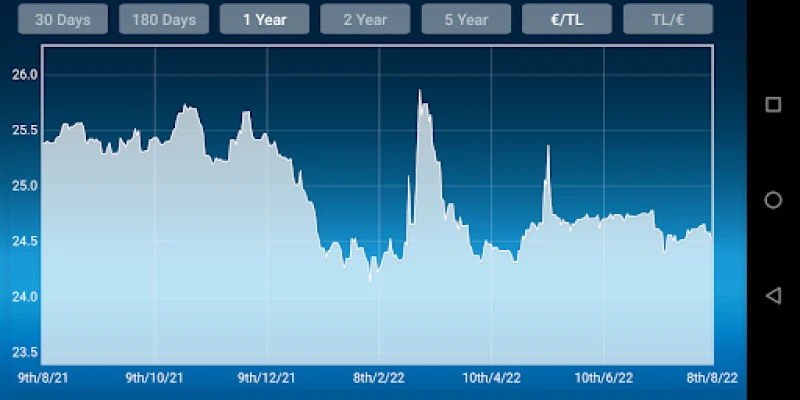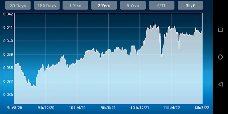 Turkey Turkish Lira Türk Lirası Lirasi kuruş try TRY TL / Euro Eur € The exchange rate is automatically updated. Easy one click conversion. Very intuitive. No decimal errors when converting. Includes charts for the last month rates, last 6 months rates and last year rates. Keyboard always on screen for a better display, it doesn't pop up. You can close the app through the exit button to stop it from consuming mobile resources. Can work offline. If the internet connection is not available, it uses the last exchange rate available.